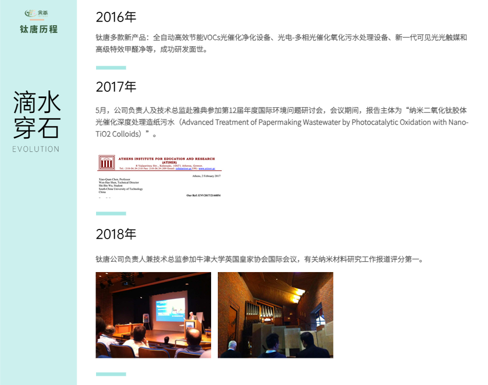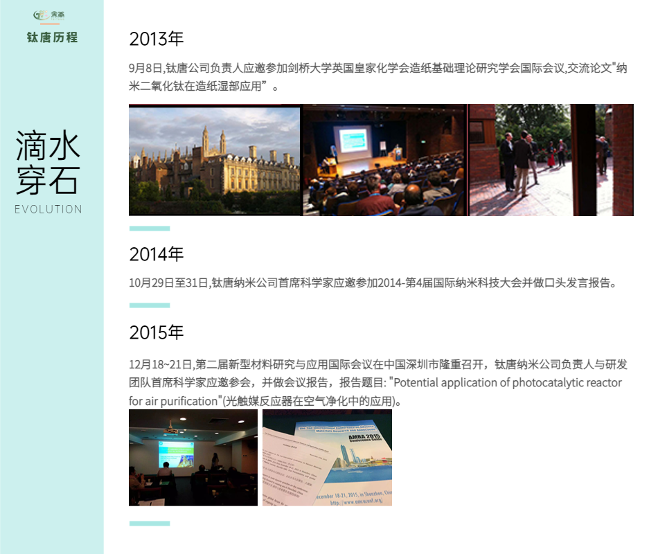 鈦唐科技有限公司是一家擁有豐富自主知識產(chǎn)權的科技型企業(yè),專(zhuān)注于納米二氧化鈦膠體、水氣凈化光催化產(chǎn)品與設備研發(fā)、生產(chǎn)與銷(xiāo)售。與廣州鈦唐納米科技有限公司屬一個(gè)集團公司。主要產(chǎn)品有納米光觸媒、納米二氧化鈦膠體、光觸媒網(wǎng)、專(zhuān)業(yè)型空氣凈化機、各種基質(zhì)材料納米光催化網(wǎng)(光觸媒網(wǎng))、工業(yè)有機污水深度處理成套設備、工業(yè)污水光催化氧化處理用光催化劑、專(zhuān)門(mén)的除甲醛產(chǎn)品特效甲醛凈、建筑外墻自潔凈納米噴劑、紡織品防紫外線(xiàn)抗菌整理劑、化妝品防紫外線(xiàn)劑、面料光觸媒、陶瓷專(zhuān)用光觸媒、甲醛異味清除二合一等產(chǎn)品。