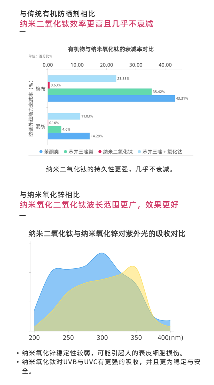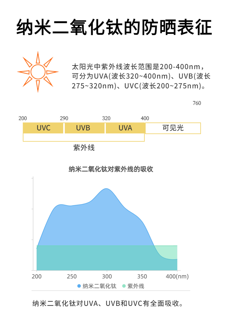 鈦唐防曬化妝品專(zhuān)用添加劑是一種高效廣譜的防紫外線(xiàn)納米無(wú)機材料添加劑,同時(shí)具有抗菌消炎效果。一次粒徑5 nm,二次粒徑100%分布30-50 nm(粉體漿3-5%左右),化學(xué)性質(zhì)穩定,無(wú)刺激,無(wú)致敏,與基料相容性好,全面吸收屏蔽紫外線(xiàn),效能持久不衰減等,是一種安全、穩定、長(cháng)效的多功能化妝品助劑。
