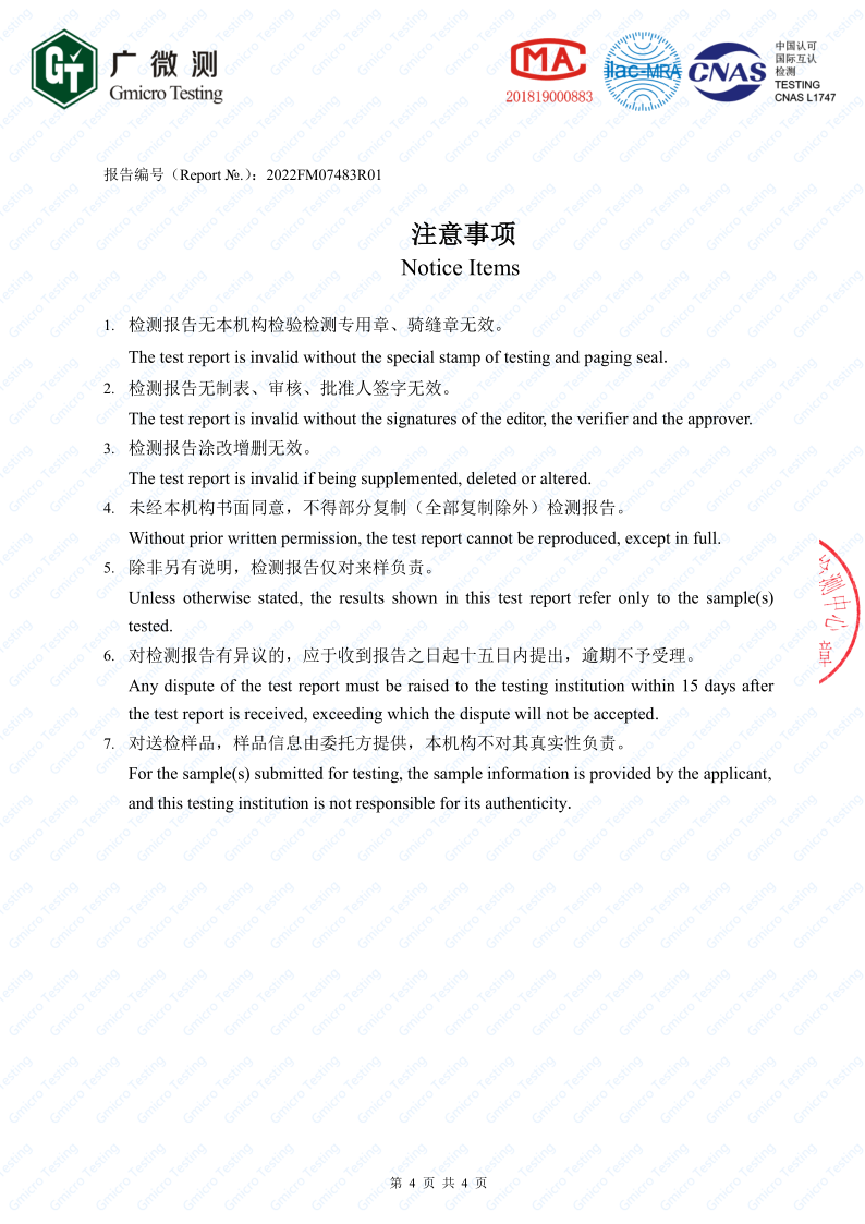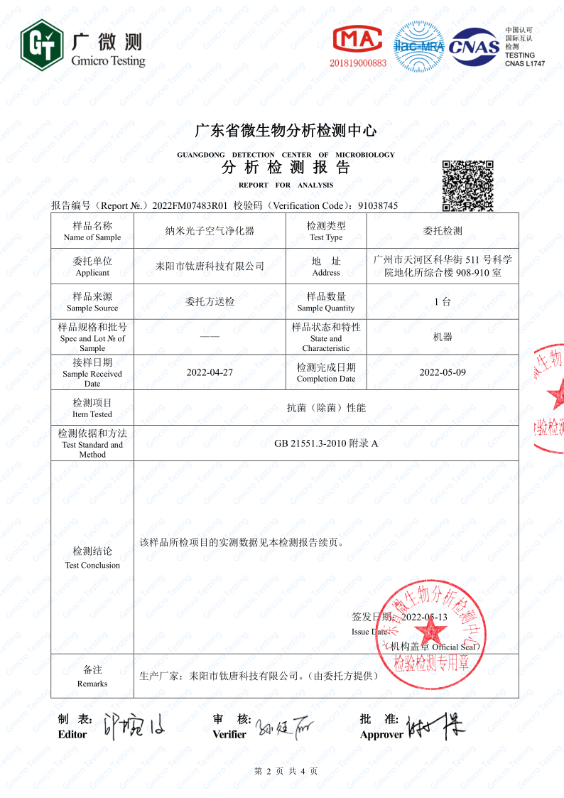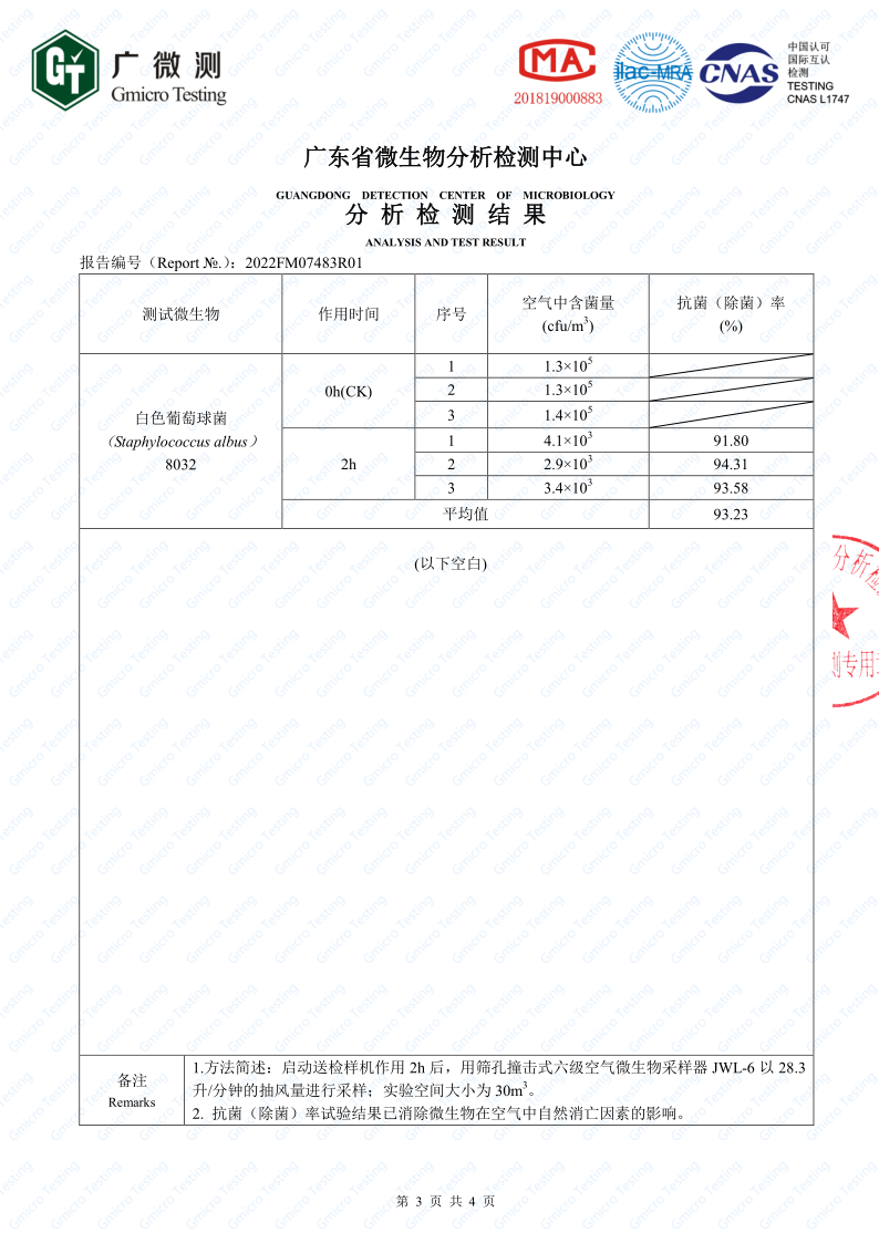 除味滅菌器抗菌檢測報告原件: